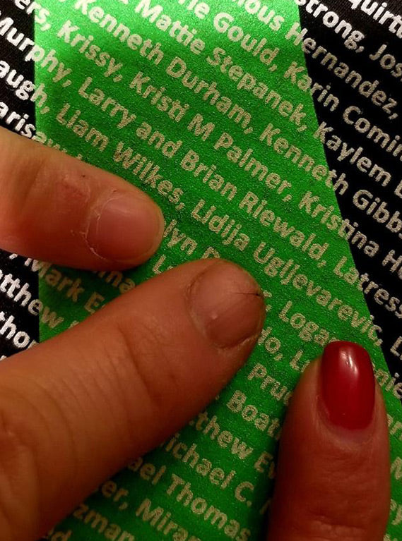 We shared stories and I told her how I had my dad’s name added to one of these shirts and I showed her the picture of the back of the shirt with his name. She said she also added her nephews name to a shirt like it. We zoomed in, and her nephew’s name was DIRECTLY ABOVE MY DADS.