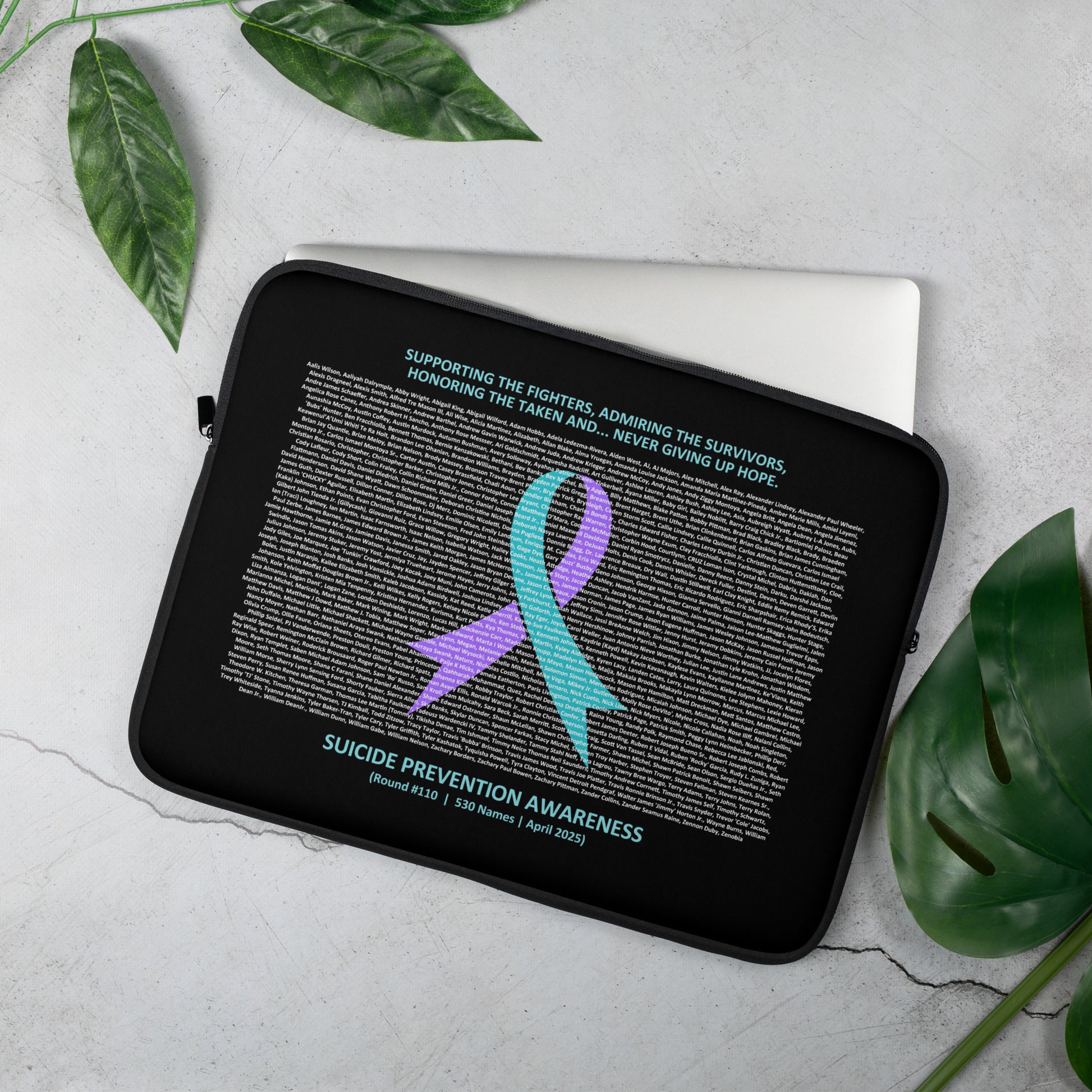 This premium laptop sleeve honors those we lost to suicide. Each name on the sleeve whispers a life, a story, and a reminder that mental health matters. It sparks conversations about a topic that is often left unspoken, encourages breaking silence, helps us remember those we've lost and also promotes hope for those still struggling.