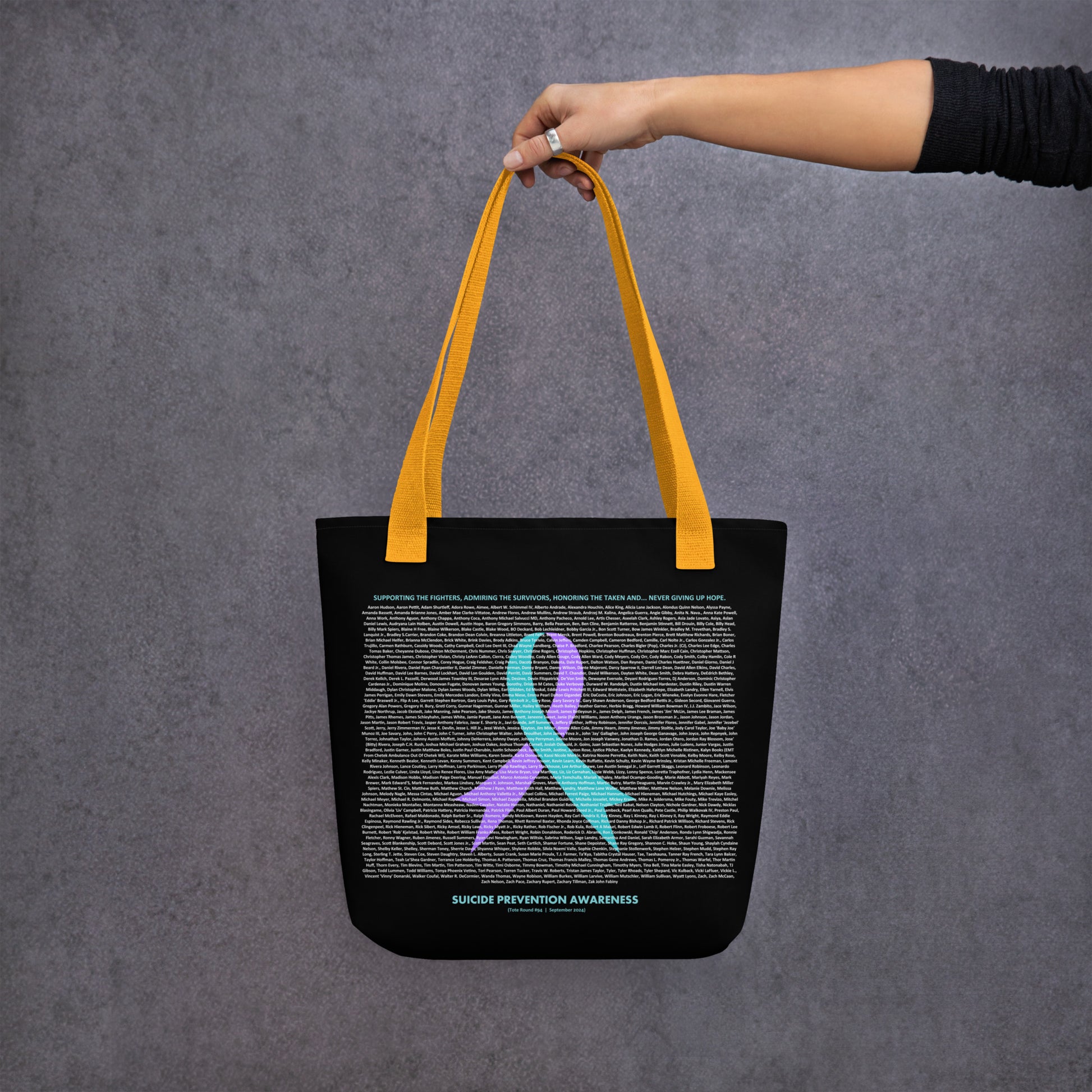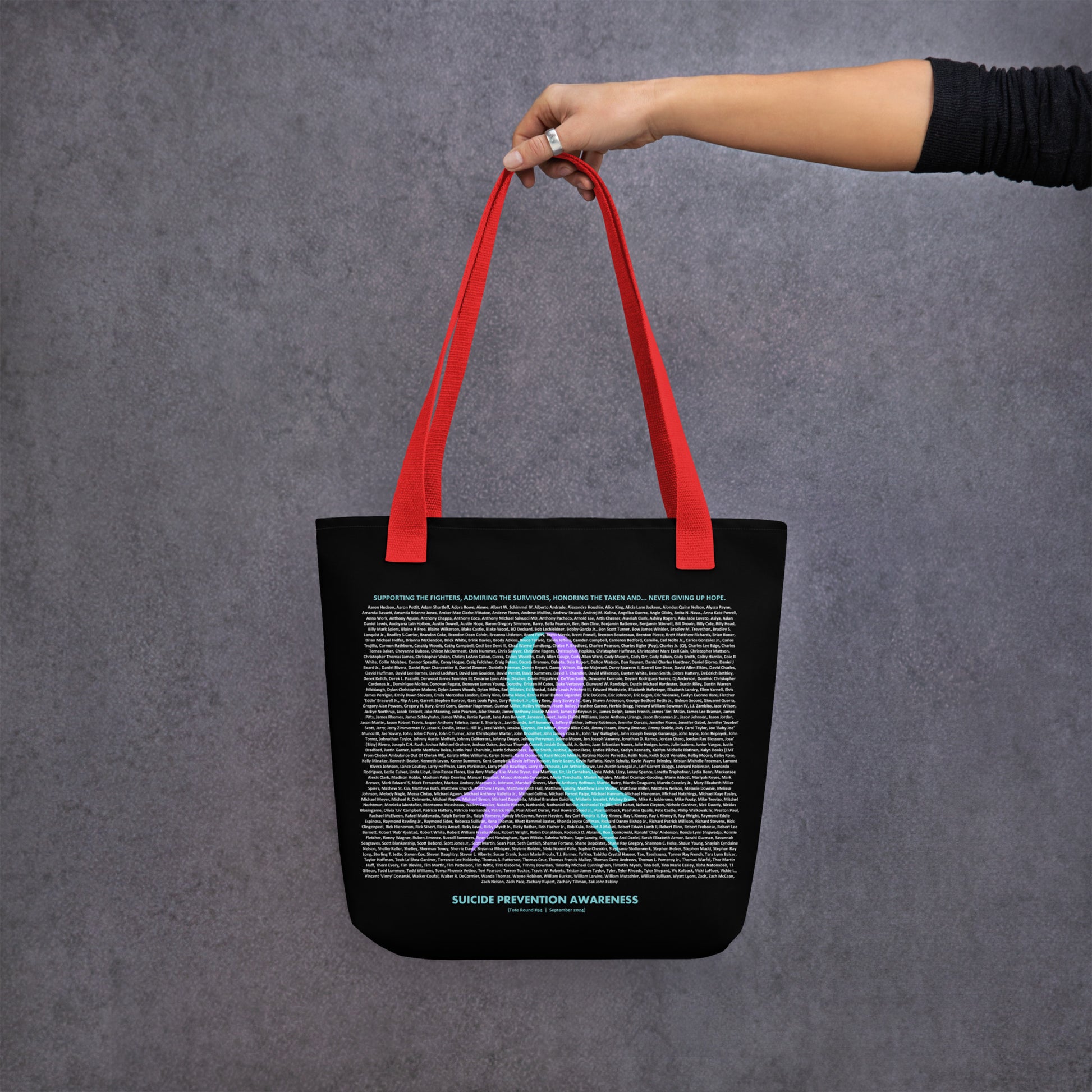 This tote bag honors those we lost to suicide. Each name on the bag whispers a life, a story, and a reminder that mental health matters. This bag sparks conversations about a topic that is often left unspoken, encourages breaking silence, helps us remember those we've lost and also promotes hope for those still struggling.