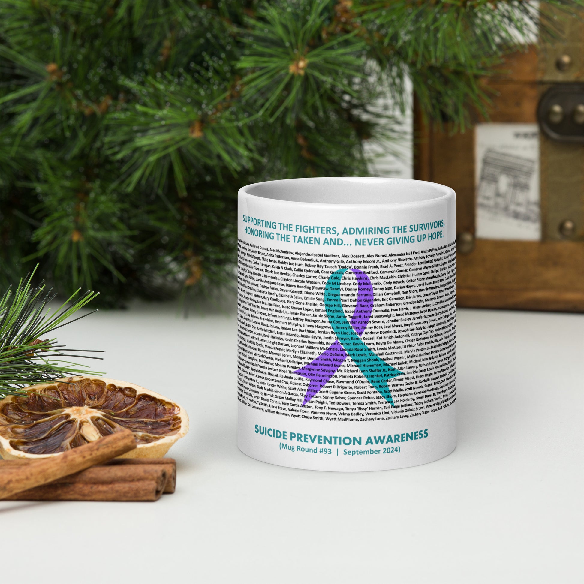 This mug honors those we lost to suicide. Each name on the mug whispers a life, a story, and a reminder that mental health matters. This mug sparks conversations about a topic that is often left unspoken, encourages breaking silence, helps us remember those we've lost and also promotes hope for those still struggling.